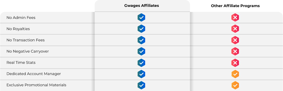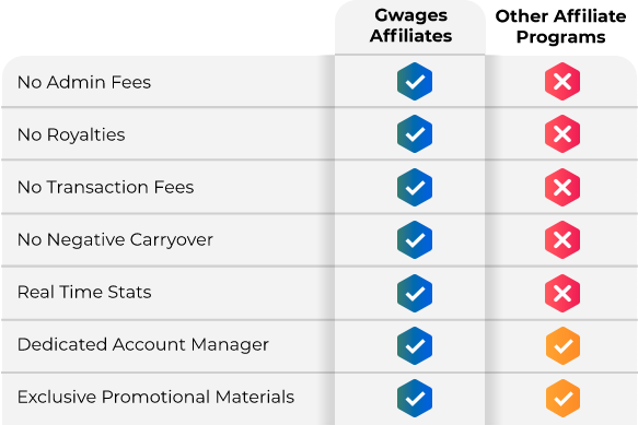 At Gwages, we pride ourselves on our transparent and rewarding commission structure. You'll receive a fair and clean share of your players' monthly net deposits with low fees.
